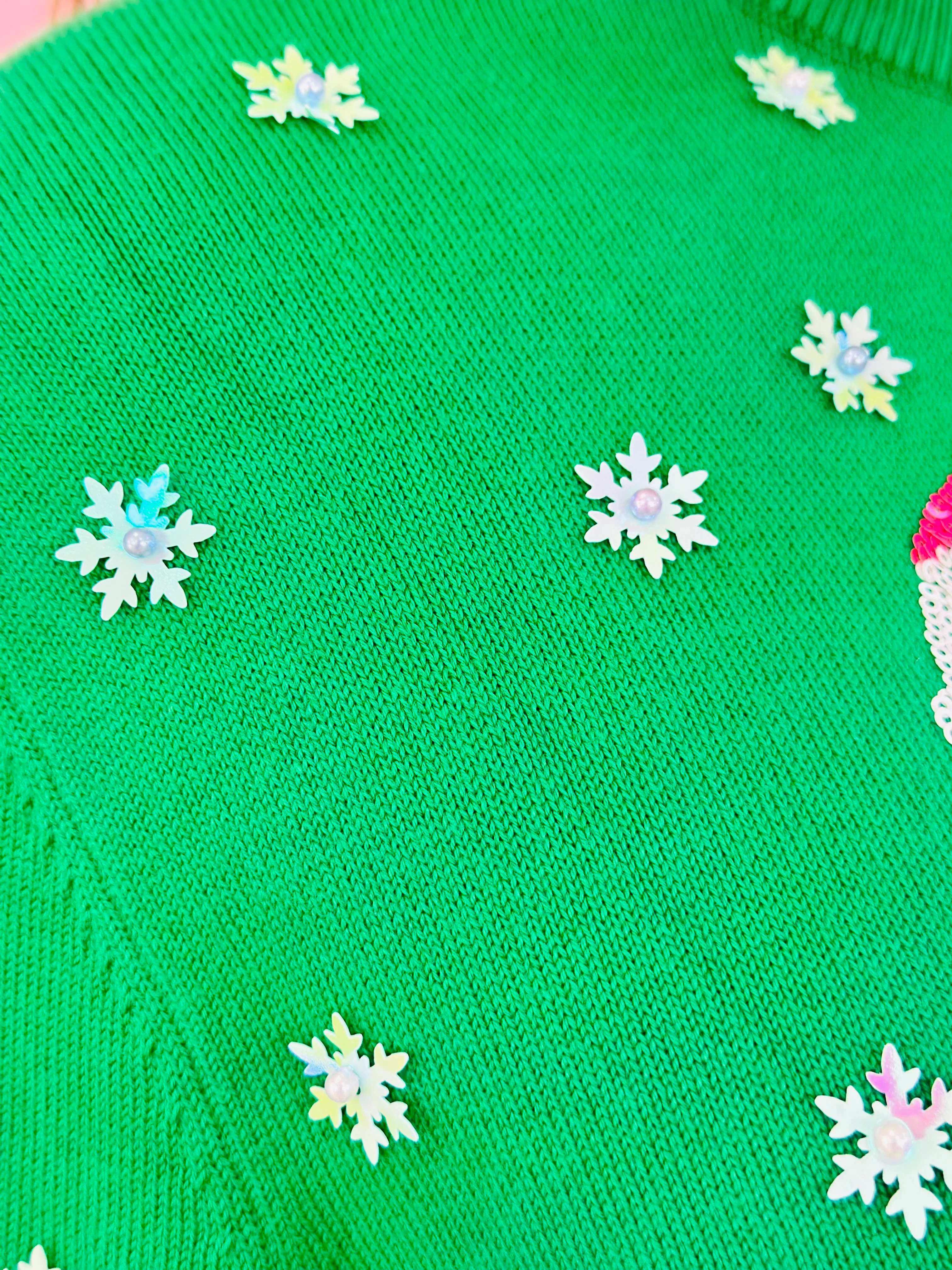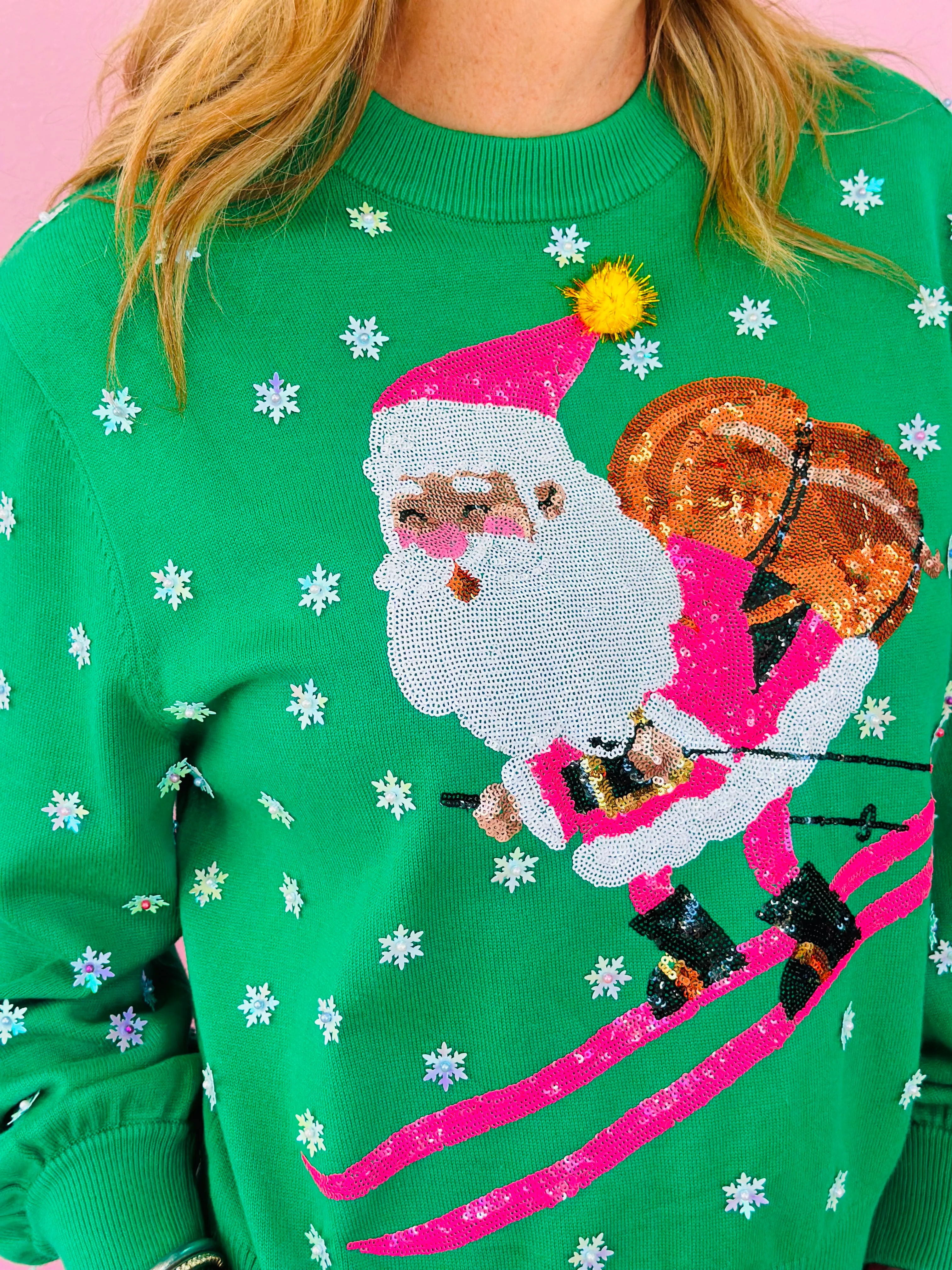 GREEN & NEON PINK SANTA SKIING SWEATER