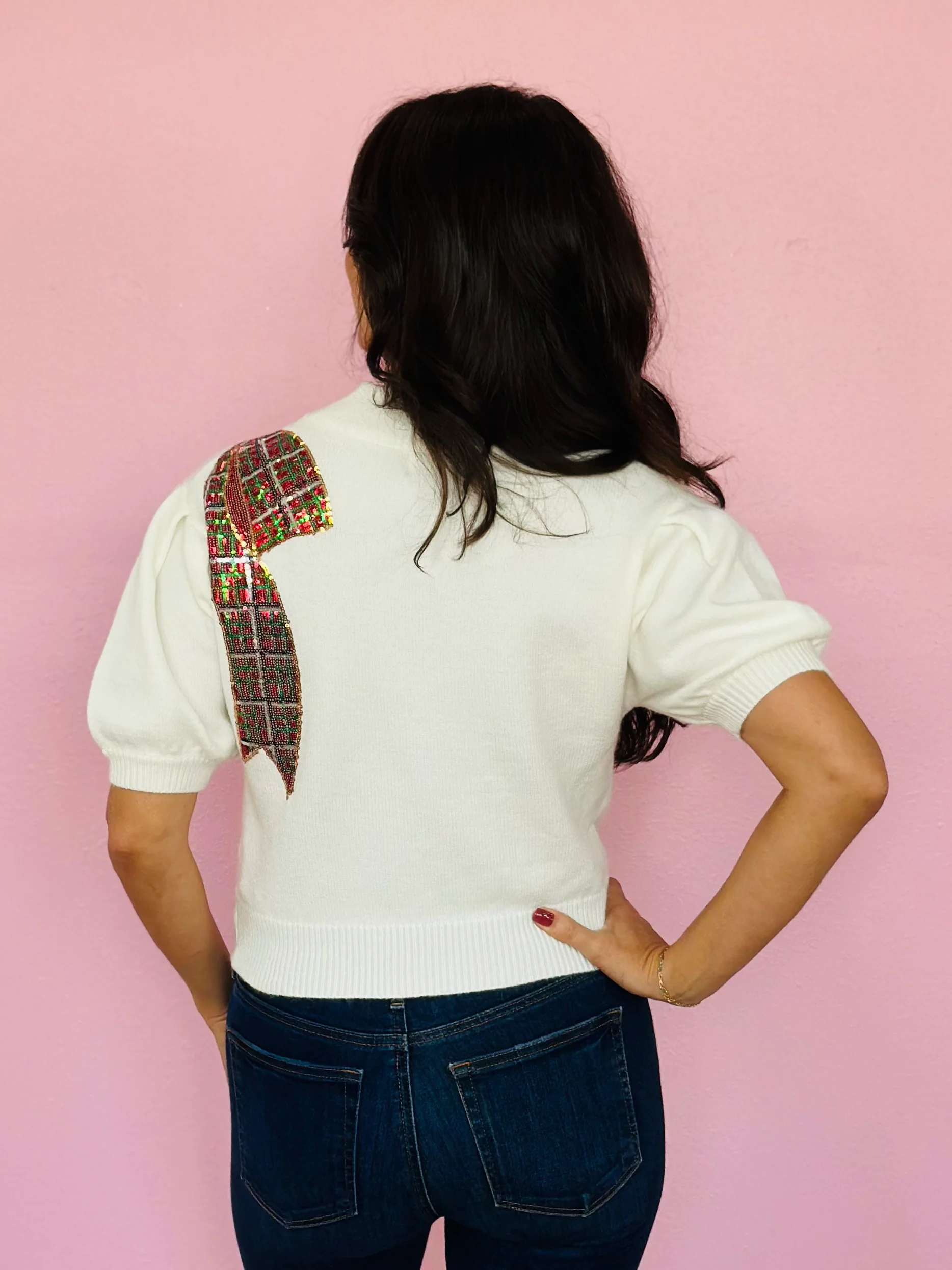 CHRISTMAS BOW SHOULDER SWEATER-WHITE